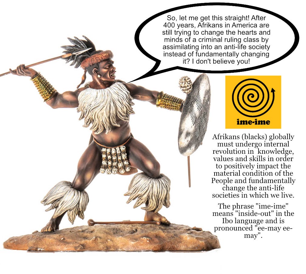 Step# 1: Implement ime-ime, Internal Revolution, which is the acquisition of the Afrikan centered Knowledge, Values and Skills (AKVS) needed to end dependency on European capitalist men.